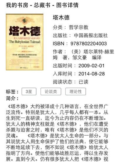 除去编排介绍之外说分类与可读性,最初买的时候本以为是介绍犹太人教育、经法等方面的书籍,但是没有研究仔细,实际上是属于心灵鸡汤那类的书,通过一些故事说明一些道理,简单易读,放在高中或大学看可能会感觉更好一点。