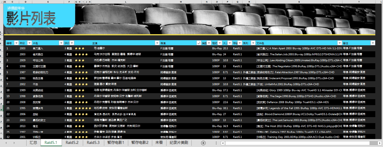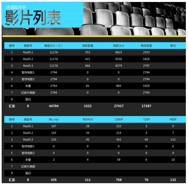收了约1500部电影,还有约80部未看的,期间坏了一块硬盘,还好只是1TB的,主要都是美剧,为了更好的保护数据,现在存储主要用Raid 5模式;期间也删除了一部分电影,主要是没有什么保存价值的国产片。